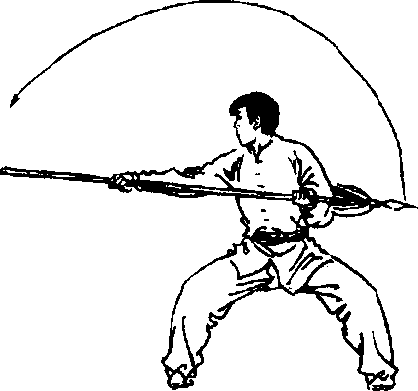 2)以左脚掌为轴,身体左转,右脚随即上步下蹲成马步; 同时,右手握杆由后向上、向前划弧,使枪尖向上、向前划弧 劈平,左手握杆仍置于胸前;目视枪把(图204)。