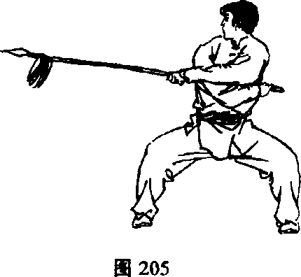2)左手成掌向左侧伸平,虎口一侧朝上;同时,右手握把 向右侧伸出扎枪;目视枪尖(图206) □