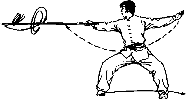 提示:两手臂上下划弧时要贴身,两手的滑把要及时、协 调,单手扎枪要直。