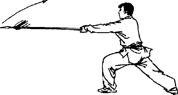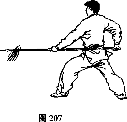 2)右脚蹬地,身体左转,左膝前弓成左弓步,同时,右手 握把,向左手处伸出扎枪;目视枪尖(图208)o
