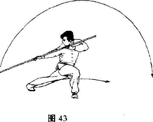 1. 预备姿势可与挑棍时相同;也可成倒插步,两手对手 握棍,右手于棍身中段,左手于棍身前段,棍斜于体右侧,棍 把朝下(图43)。