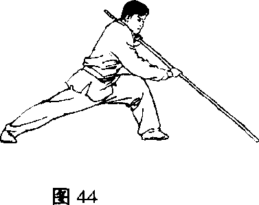 2. 左脚上一步成左弓步;同时两手使棍把一端由后向 上、向前、向下劈盖(图44)。