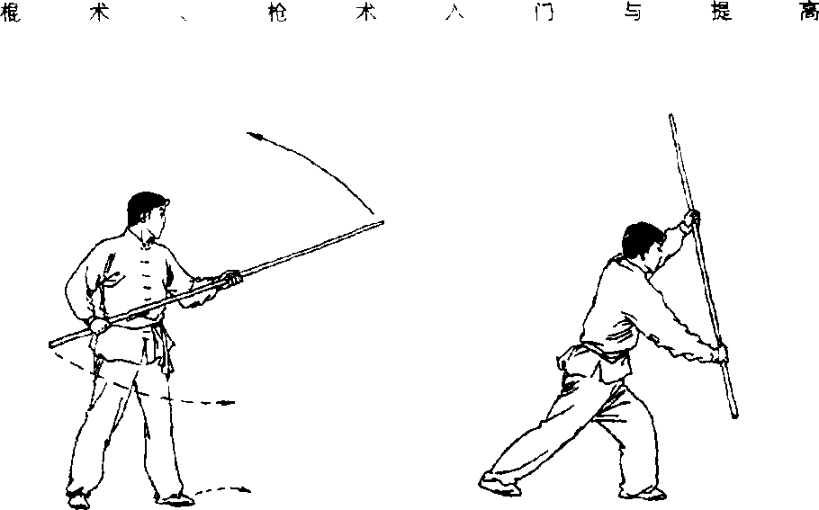 棍法含义:属近距离进攻性动作。主要以棍身推撞对方 躯干部位。动作:1. 预备姿势同格棍(图75)。2. 左脚向前跨一大步,两手握棍以棍身向前推击,棍斜 于体前(图76);也可棍成水平横推。要点:推棍要佯同身体重心前移,两手同时用力。练习:按动作图示反复体会,结合行进间练习,棍梢、棍把交替 在上。易犯错误:身体步法未跟上,与推棍用力不一致。纠正方法:按要点体会,也可两人一组配合做攻防练习。