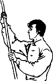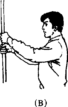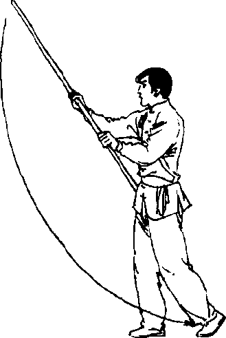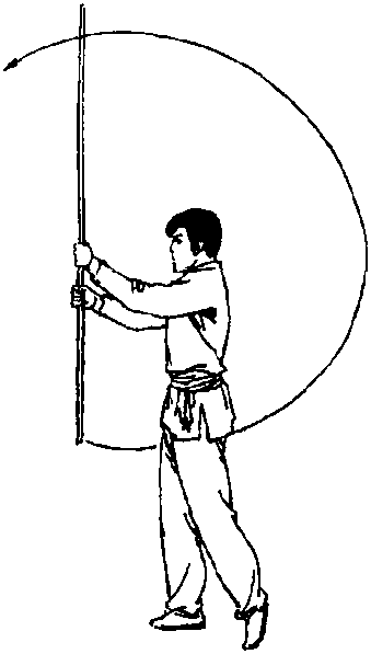 棍法含义:属防御性动作D主要用于遭受多方位攻击或 对方抛出器械打来时。是套路中连接动作的重要技术。动作:1. 两手正握于棍身中段(偏于棍把一端),两脚前后开立(A)(A)(图 77"(图 77"(A)(A)(图 77"(图 77"图772.左手松握,右手向右后下方抽棍,并由后向上、向前立 圆绕行劈把;左手随棍身转动成钳把握棍,棍梢伴同由上向前、向下、向右后方绕行(图78)。