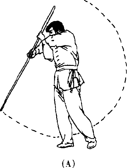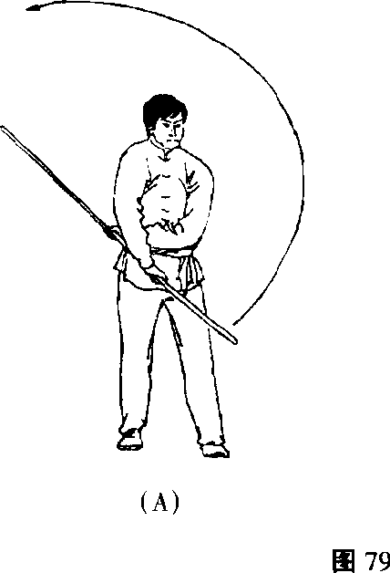 6. 两手继续使棍梢一端向后、向上、向前立圆绕行,即还 原为动作1(参见图77)。