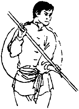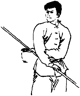 棍梢、棍把始终伴同在相反位置上立圆绕行。一般棍把 前劈后下挂于体左侧,棍梢前劈下挂于体右侧;一手前劈下 挂,另一手为钳把。动作要连贯。