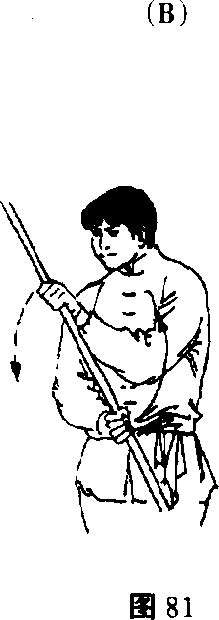 4. 上动不停。左手握棍使棍梢向上、向前立圆绕行劈棍 (图 81)。