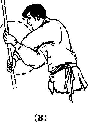 5. 上动不停。重心前移。两手使棍梢一端继续向右腿外 侧下挂;两臂自然交叉,右手成钳把握棍(图82A、B)°