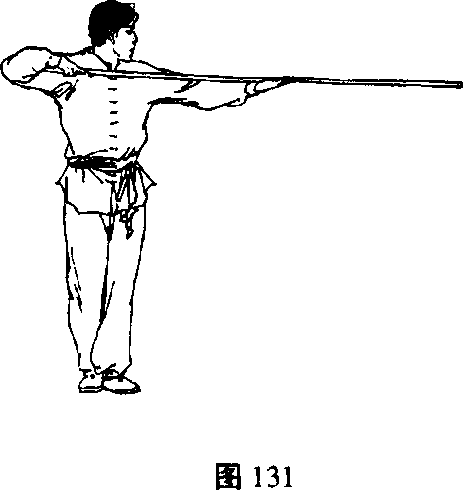 一手握棍,另一手向上平托;高与胸平(图131)。