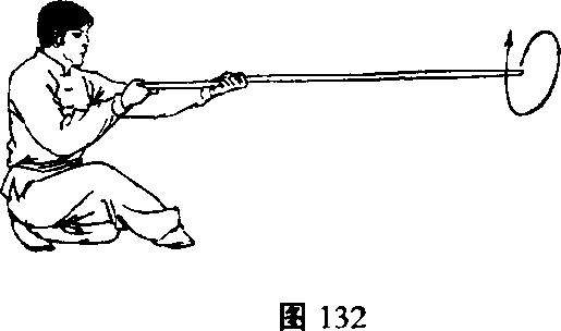1. 两手正握,右手握棍把,左手螺把握棍身后段,将棍平 举于体左前方,两腿下蹲成歇步(图132) o