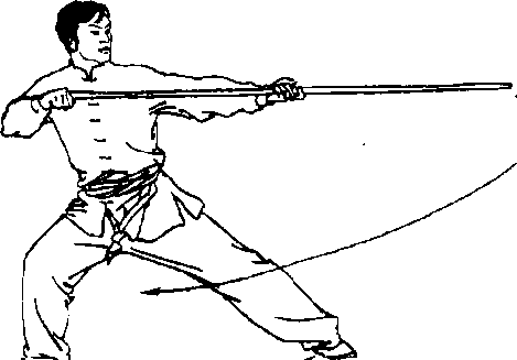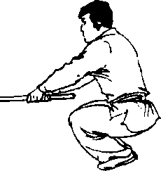 3. 身体继续右转,左脚向右脚靠拢下蹲;同时两手用力 使棍自左向右下扫,左手滑把于右手附近(图134)。
