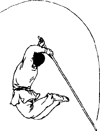 4. 两脚用力蹬地跳起,两小腿后屈,挺胸展髓;同时两手 向上、向后举棍(图135)。