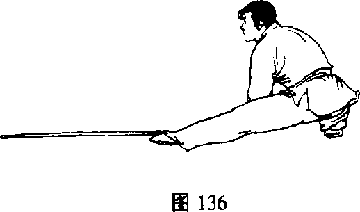 5. 两脚落地成左仆步;同时两手握棍向下摔棍,目视棍 前端(图136)。