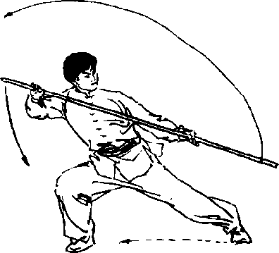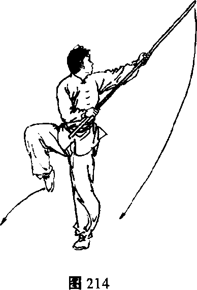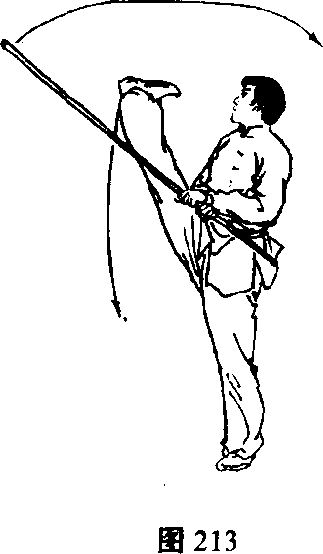 1)上体稍左转,右腿屈膝回收,脚背绷紧;同时,左手向棍 中部滑握并向左侧拉开,使棍梢向上、向左侧划弧;目视左侧 (图 214) o