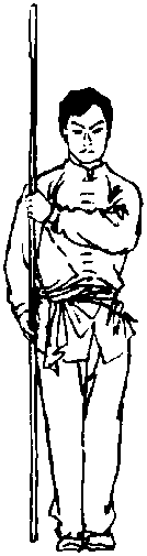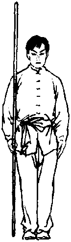 1) 身体直立,左脚收并于右脚内侧;同时,左手握棍上举 后下落至右肩前,右手下落滑握于棍身中段;目视正前方(图 216)0