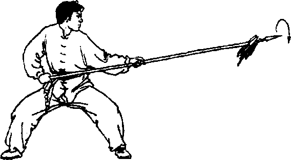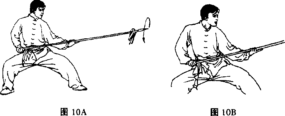 2. 以左手为主,使枪前段由里向上、向外绕行,枪尖绕一 20厘米直径的圆弧(图10A、B),为拦枪。
