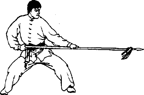 4. 半马步持枪,做拦枪、拿枪、扎枪复合动作的反复练 习。