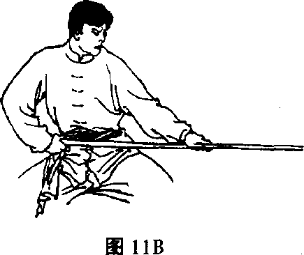 3. 以左手为主,使枪前段由外向上、向里、向下绕行枪尖 绕一 20厘米直径的圆弧(图11A、B),为拿枪。