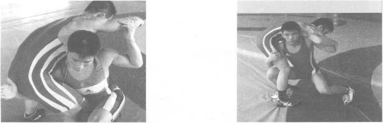 图 2 - 27 图 2-28图 2 - 27 图 2-28在自由式摔跤和女子摔跤中上、下肢的配合技术是技术发展的趋势,通过上肢把位的控制 进而获得下肢把位(图2 — 27),或者上下肢一起抱握(图2 — 28)都是常见的技术动作。