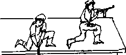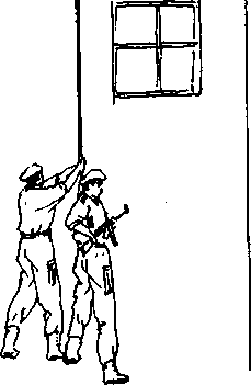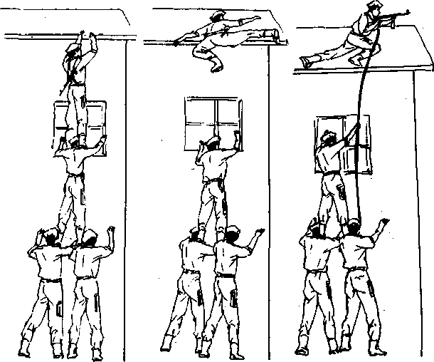 对于较低的平房*可搭两层人梯攀登而上。但如果攀登校 高的平房,则需要搭三层人梯攀登而上。其具体方法是;底层 两人先左右两腿分开,并下蹲'两手扶墙以减轻压力,上体要 稍向前倾m然后第二层的队员亦取蹲式并踩在底层人的左右