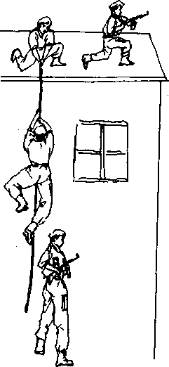待第二层队员整窗而上后(图508、须立即放下绳索,并 将下两人迅速拉上(图509).