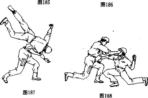 图184图184L动作妾领在格斗中,当 敌人由后突然将我连臂抱住时 (图184),我可在起脚猛踩敌背 的同时,猛抬双肘并前伸与肩平 (图185)#接着身体略向右转,并 以右肘猛击敌人肋部,以迫使敌 人松抱(图186),然后,上动不 停,再用右手拥住敌右肘上方部 位,左手则抓住其右手腕将敌人 从头背后摔下(图187),随后可 再予以擒拿或重击(图188),将 其制服或击毙■