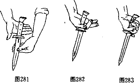 在格斗中使用匕首,关键在于握紧(图281、图282、图 283),如握而不紧,不但不能有效的刺杀对手*还会有易被敌 方一举击飞的危险十