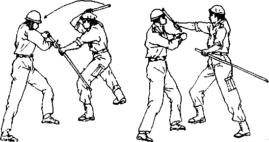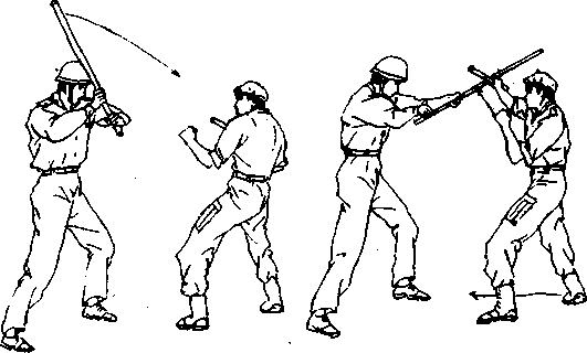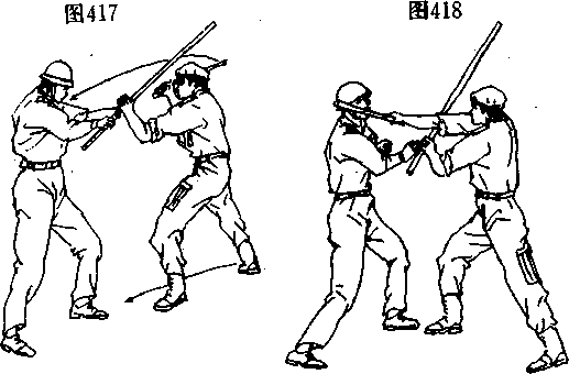 左手拨开来棍(图419),并以短棍迅速攻击对手的头部要害 处(图420),将其击昏或击毙,