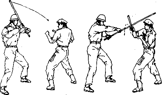 当与敌搏斗时,最关键的是不要害怕,一旦产生恐惧心 理,本来挺灵活的手脚也会变得僵硬了。而且既然我手持短 棍,所以对手也会有所顾忌.相反如果自己?旦产生恐俱心 理,就必然会过早地把目光从对手的动作上移开。而目标一旦 转移,就绝对没有取胜的希望,因此,必须从始至终一直盯着 对手,就能在对手即将刺到我的一瞬间?得以闪开。而且'此时 还有机会朝原来的目标还击对手一棒,将其制服或击毙。