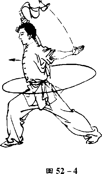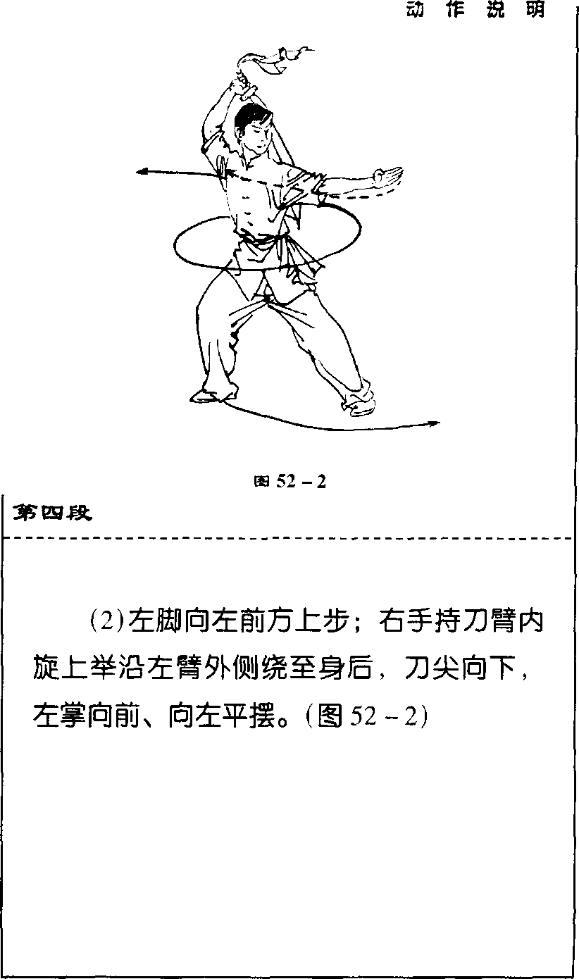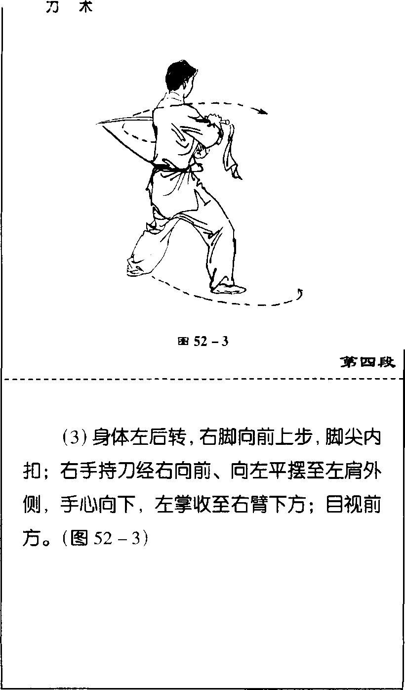 (1)右手持刀向下、向左摆动,左掌向 左、向下收至腹前,两臂成交叉状;目视 前方。(图52-1)第四段