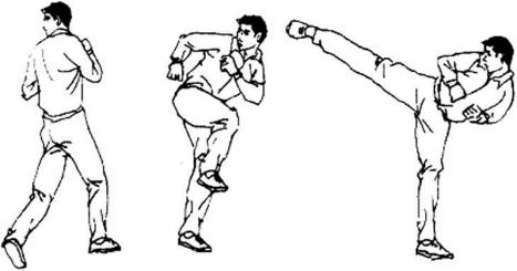 方法由戒备势起重心偏至左脚上体右转180。以头领身转体左脚脚掌为轴同时朦地内扣。右膝顺势提起从右后方成弧线向前上方边摆边伸直旋击呼气发力力达脚跟或全脚掌上体左侧倾眼视攻击方向(图