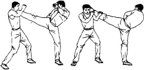 3阻截原地中段旋踢阻截远距直线拳击。(图378、379)