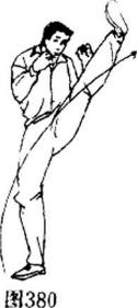 (也可稍弯)勾脚尖外翻,从右向上经面前向左侧弧线扇面横摆击出呼气发力力达脚背眼视前方。(图380)动作完成速恢复戒备势。