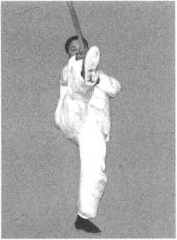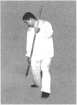 动作说明:接上式,脚顺势向后落地,棍向后抽压。眼视棍尾。(图44)