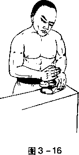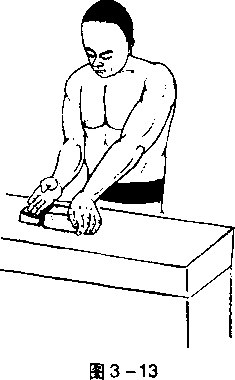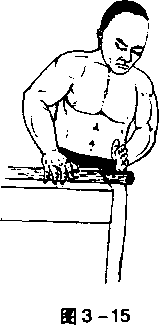 将直径约10厘米粗的杉木或松木 棍放在平台边沿,木棍一段悬空,另一 段用右手按压住,然后用左掌棱由上向 下切击木棍悬空的一段。(图3-15)