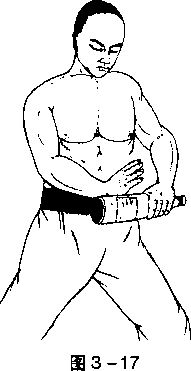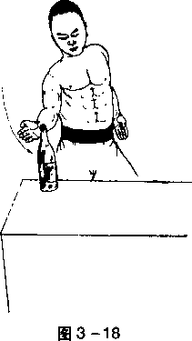 将酒瓶立放在平台上,右手成掌,掌心向上,用掌棱由右向左横切酒瓶上端。(图3-18) 要点与劈切相同。