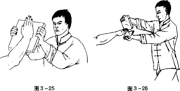 助手双手上下持住木板两边,两臂平举前伸,我在其正前方站 立,右掌用指尖由后向前戳击木板中部。(图3-26)