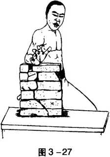 马步蹲立于砖前,吸气,以意领气于右掌,屈臂收提至右肩前, 掌指向下,掌心向里;吸足一口气的刹那间,右掌以掌棱向重叠的砖 面中部劈下。以砖断裂的块数而测定功力的深浅。(图3-27)