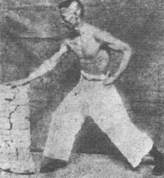 顾汝章先生在示范拍掌时,手掌到处,重叠的12块砖立刻碎裂。 (图 3-28)