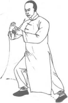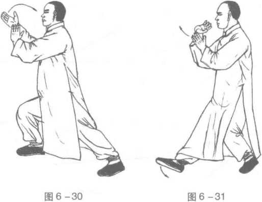 2 .重心左移,左膝屈蹲,右膝伸直,脚尖跷起成右虚步状;同时,右掌以腕为 轴向右缠绕,掌心向上,右肘随之弯曲;左掌护住右腕内侧,目视右掌。(图6-31)