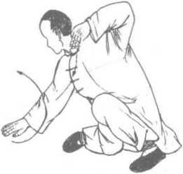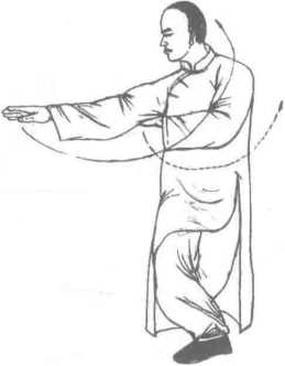 1 .两腿同时用力,身体稍起;左掌向右腋下插 掌,掌心向下;右掌弧形上摆掌,掌心向下,高与腋 平,目视右掌。(图6-34)