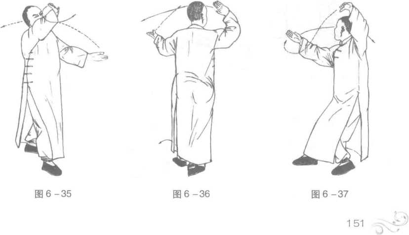 图 6-34图 6-34移至右脚;同时,左掌心向上、向左平摆,左臂自然伸直,高与肩平,指尖向左; 右掌顺势经额前向右弧形摆至头的右侧,右臂屈成弧形,高于头顶平,指尖向左, 掌心向上,目视右掌。(图6-36)