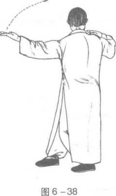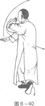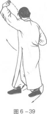1 .两脚不变,身体右转,重心稍下沉;同时,左臂内旋,左掌下落右摆,掌 高与肩平,掌心向上,指尖向左;右臂外旋,使右掌心逐渐向下外撑,掌高与肩 平,右臂成弧形,目视右掌° (图6-38)2 .步形不变,上体略左转;同时,左臂外旋,左掌向右上摆起,高过头顶, 掌心向上,指尖向右;右臂稍伸直,右掌下按于胯外侧,掌心向下,指尖向右前 方,目视右掌。(图6-39)3 .右脚向左脚左后方插步,脚前掌着地;同时,右掌继续下沉左摆,高与腹 平,掌心向下,指尖向前;左掌经额前画弧,屈臂于胸前,掌心向前,指尖向右, 目视右掌。(图6-40)