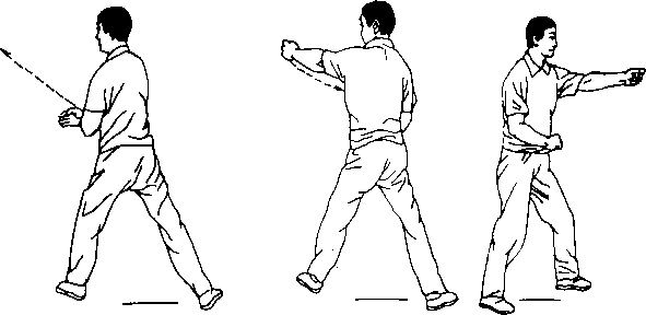 三角步。同时左前臂外旋略上抬左格,左手成拳,拳心朝上,拳 同肩高;右前臂退肘略收,右手成单珠拳前冲、拳同胸高,拳心 朝左。眼视西北。(图2—102)