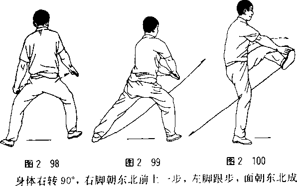左腿略屈朝东北上抬踢出,脚面外翻,力达脚拇趾内侧;右 脚支撑,腿略屈。右手不变;左掌略左摆,掌心朝右。两眼平视。 (图 2—100)