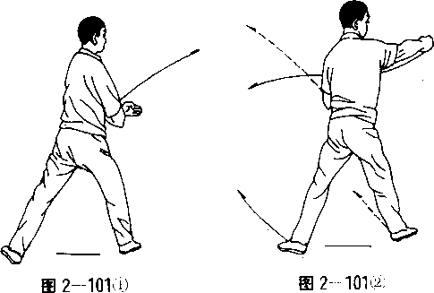 (2) 上动不停,脚步不变。右手握单珠拳朝前上击出,拳高 于肩,拳心朝左;左手成拳收于腹前,拳心朝下。两眼平视。(图 2—101 ②)