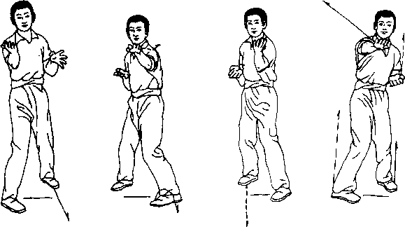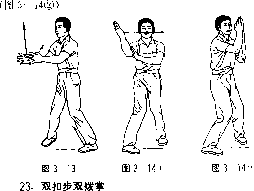 (1) 重心略升高,左脚向北退步,右脚跟外展成双扣步,面 向正南。同时右前臂外旋,略外展,屈肘里靠,掌心斜朝内后方, 掌指齐眉高;左臂内旋屈肘,左前臂里摆,掌心贴于右肘内侧"两 掌指均并拢。眼视正南。(图3 - 14①)