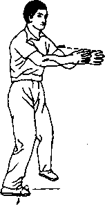 重心略升高,脚步不变。抬腕,掌 指朝前,两掌胸前平插,臂略弯曲,两 掌相距20厘米,掌心左右相对。两眼 平视。(图3—16)