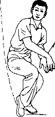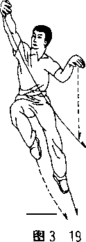 右脚蹬地,向左后后跳。腾空时右臂外旋,掌心向后(掌背 朝前),速朝正南弹击,右臂略直、屈腕,拇指一侧朝上;左臂自 然后带,前臂里旋屈腕,掌指朝下。眼视右掌。(图3—19)
