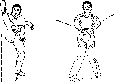 重心略起,左膝略屈。右F顺坊略抬,抬右脚向正南侧弹踢。 眼视正南。(图3—21)